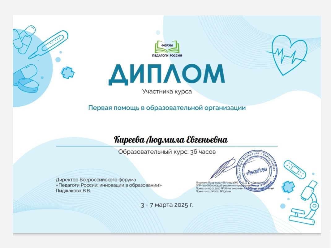 Диплом "Первая попощь в образовательной организации"